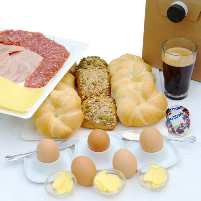 An assortment of 10 freshly baked rolls, boiled eggs, black coffee or tea, served with butter, preserves, salami, ham & cheese. Serves 5.